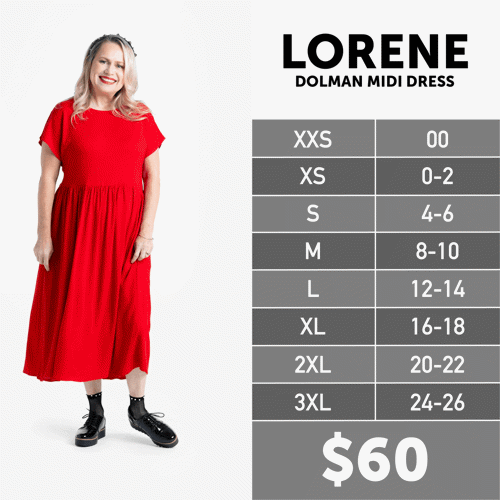Introducing the Lorene Dolman Midi Dress - flirty, flowy, and full of charm. This dress features playful dolman sleeves, shirring at the waist, and pockets for convenience. The tacked-down keyhole adds a hint of sass, while the relaxed fit and midi length keep you comfy and cute. Available in sizes XXS to 3XL in a soft and breathable Rayon Span Slub Challis fabric.